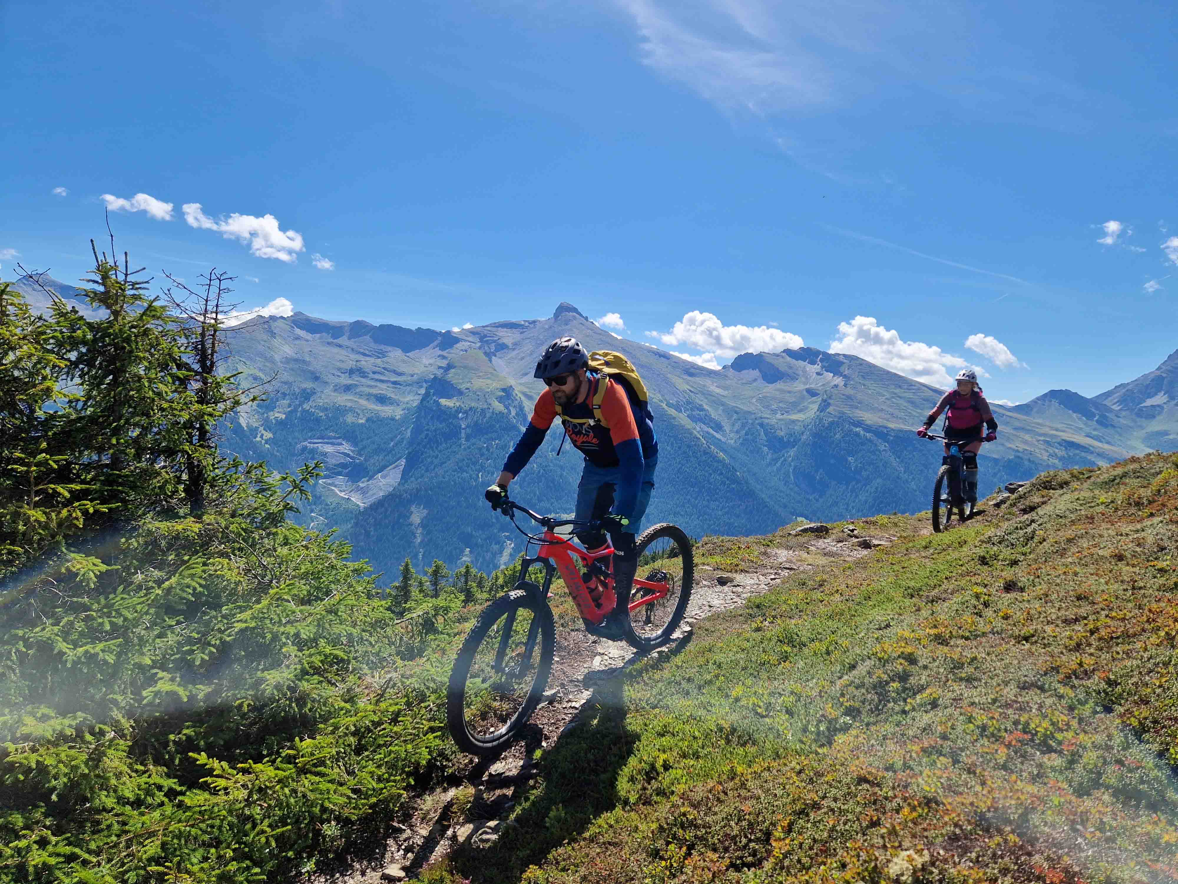 Wir empfehlen dringend ein vollgefedertes Fahrrad mit 120 oder 140 mm Federweg, da dies ein guter Kompromiss für Aufstiege und Abfahrten ist.